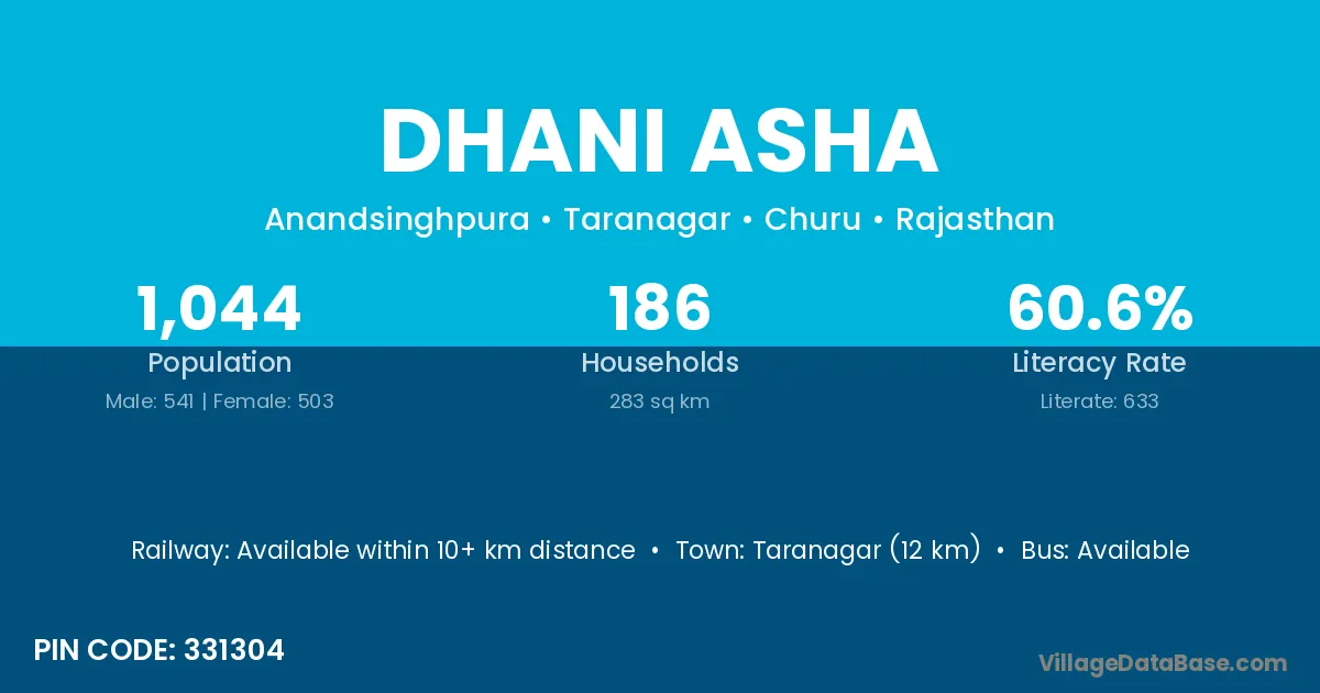 According to Census 2011 information, the village code of Dhani Asha village is 331304.