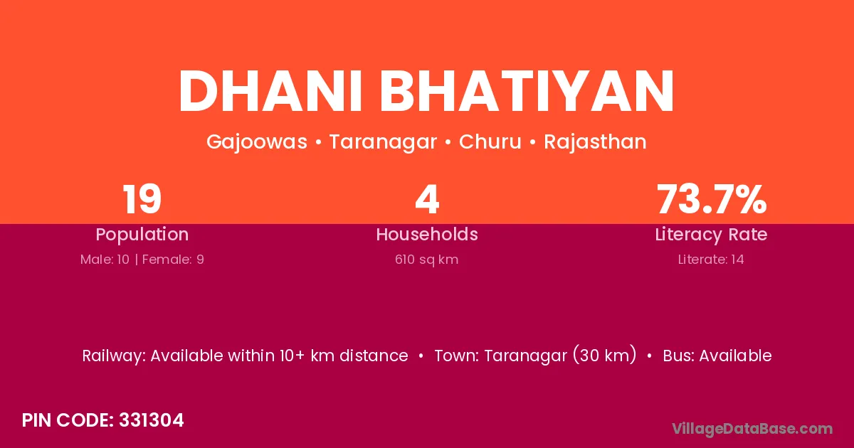 Dhani Bhatiyan village has a total population of 19 people, of which 10 are males and 9 are females.