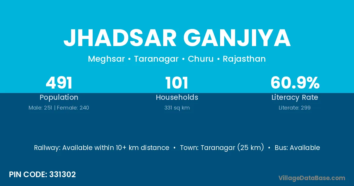 Taranagar (25 km) is the nearest town to Jhadsar Ganjiya village for major economic activities and is located approximately 25 km away.