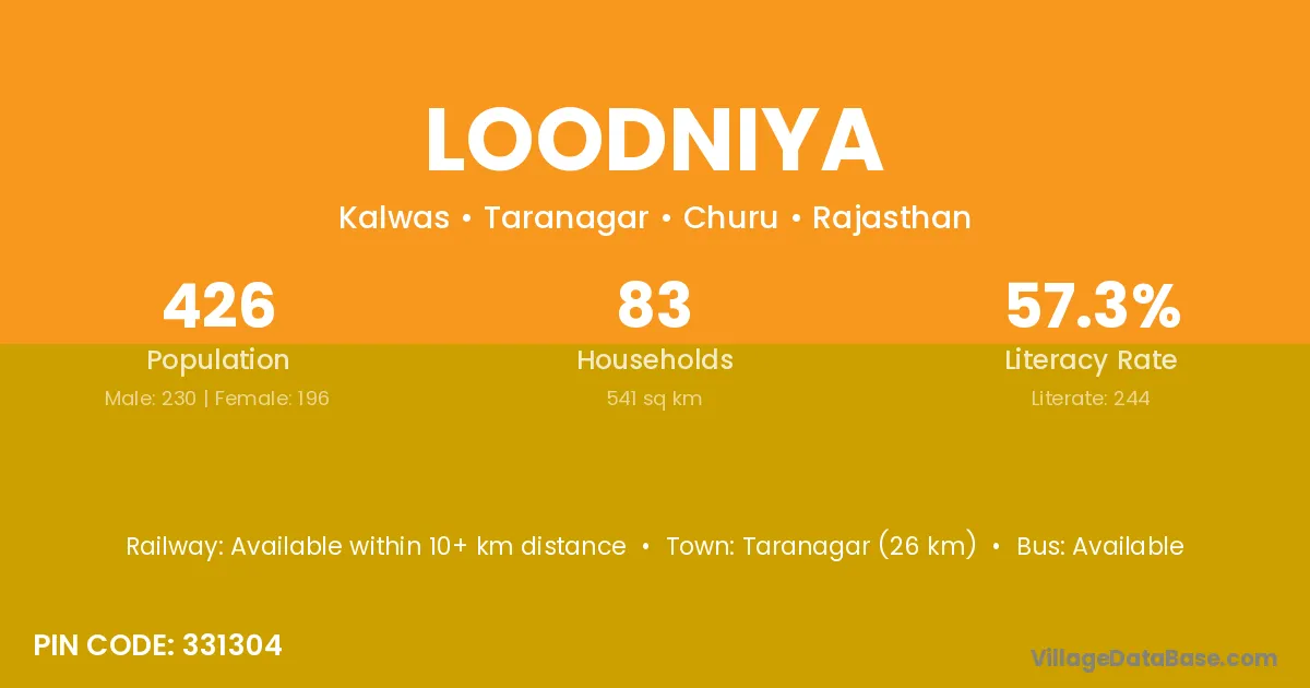 Taranagar (26 km) is the nearest town to Loodniya village for major economic activities and is located approximately 26 km away.