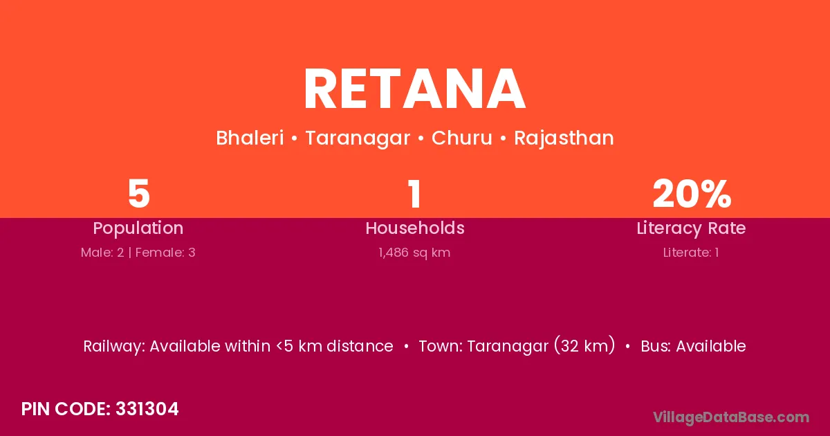 Taranagar (32 km) is the nearest town to Retana village for major economic activities and is located approximately 32 km away.