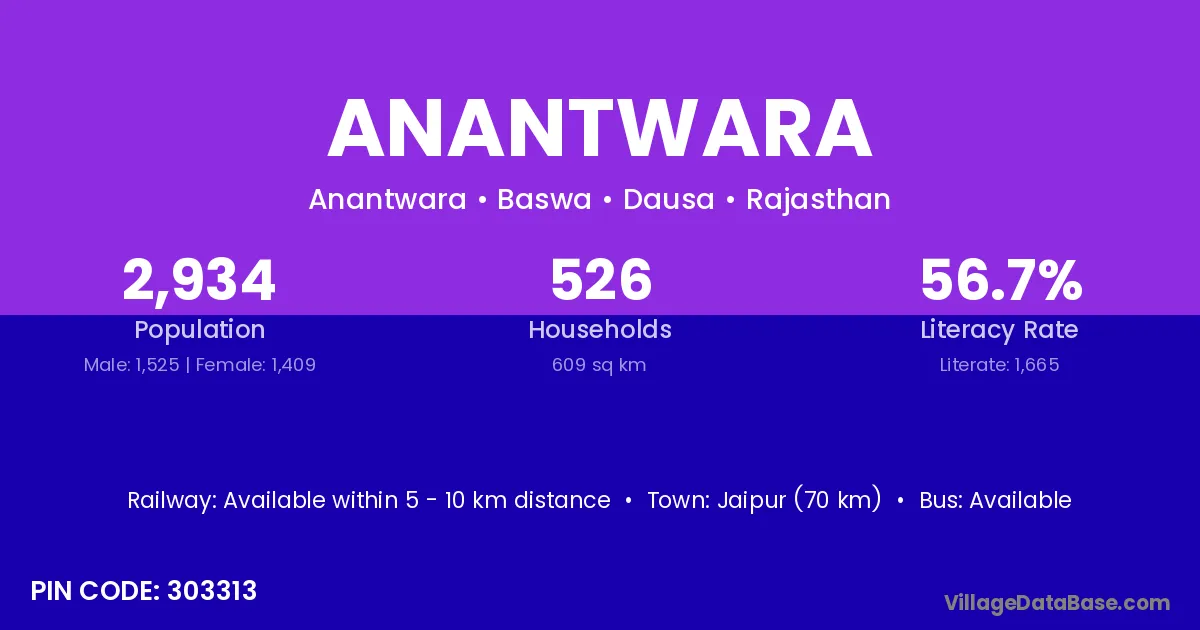Jaipur (70 km) is the nearest town to Anantwara village for major economic activities and is located approximately 70 km away.