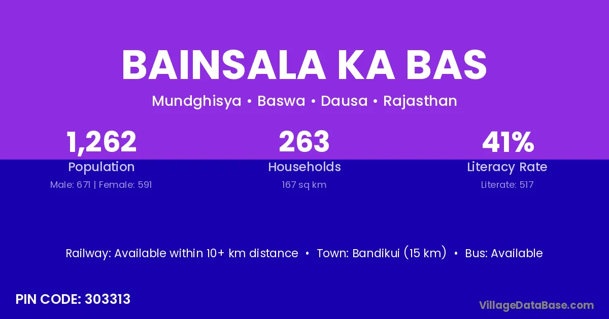 Bainsala Ka Bas village has a total population of 1,262 people, of which 671 are males and 591 are females.