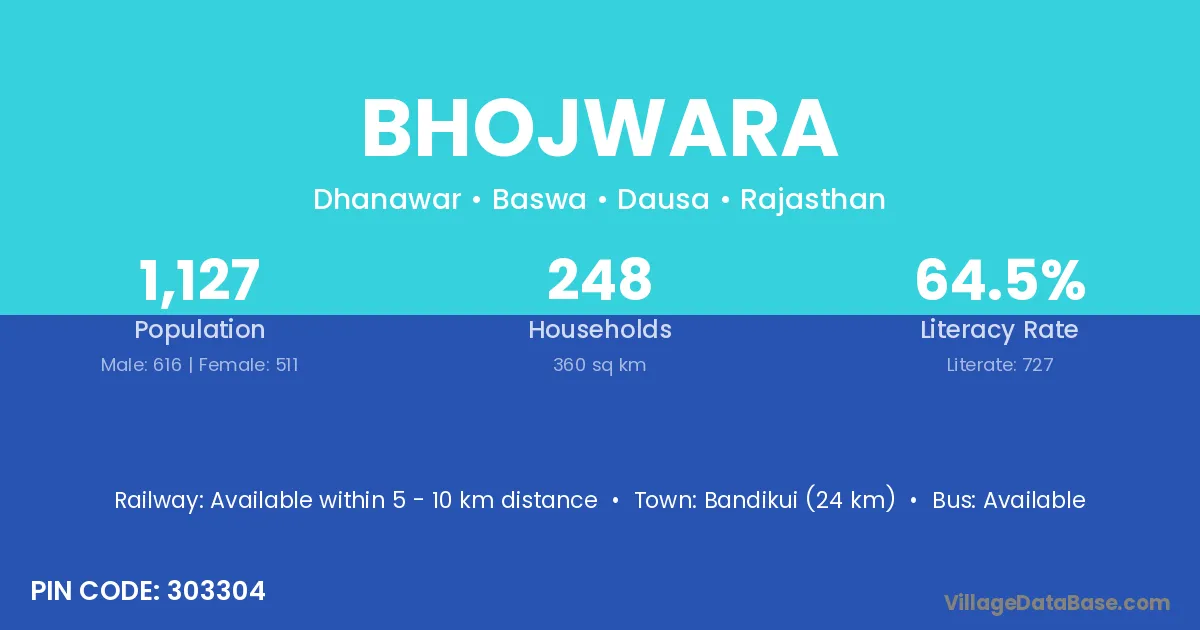 Bandikui (24 km) is the nearest town to Bhojwara village for major economic activities and is located approximately 24 km away.