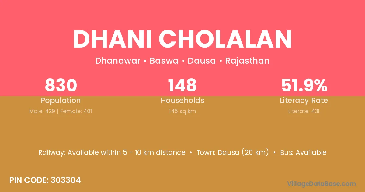 Dhani Cholalan village has a total population of 830 people, of which 429 are males and 401 are females.