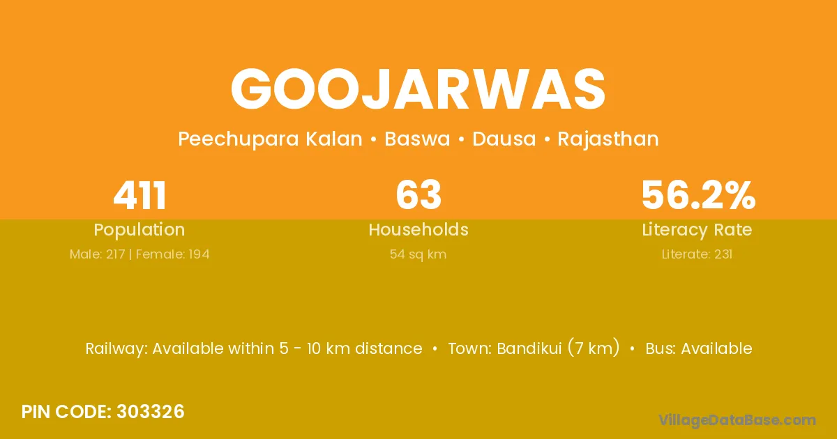 Bandikui (7 km) is the nearest town to Goojarwas village for major economic activities and is located approximately 7 km away.