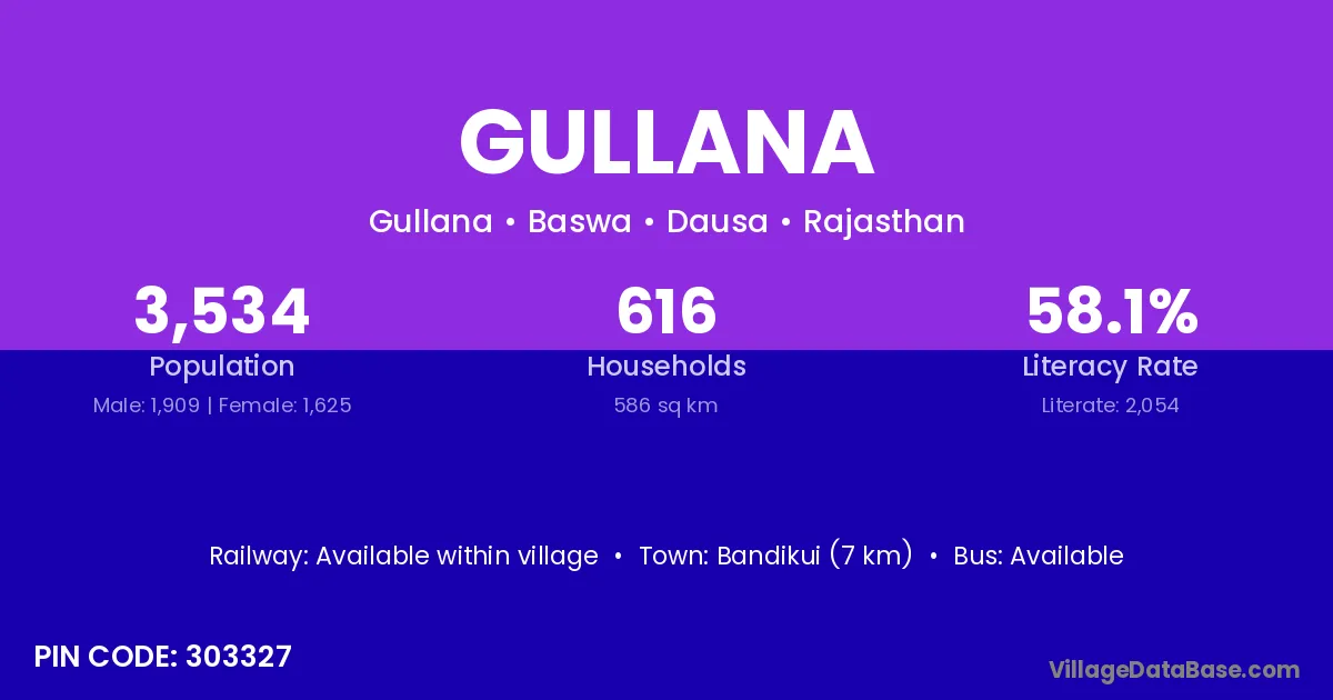 Bandikui (7 km) is the nearest town to Gullana village for major economic activities and is located approximately 7 km away.