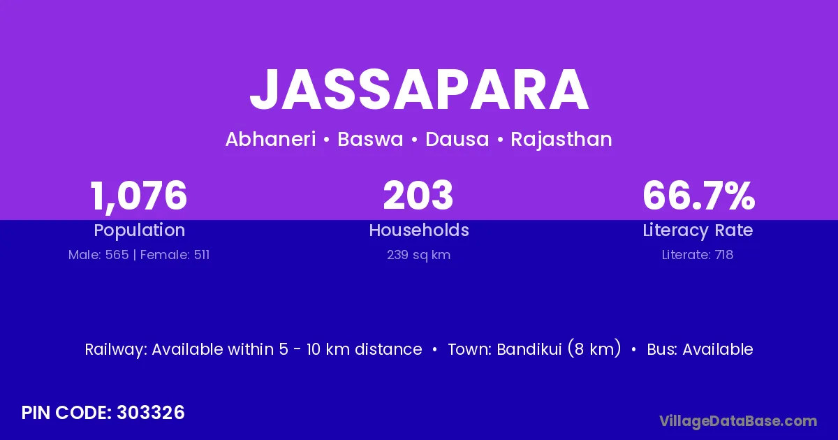 Bandikui (8 km) is the nearest town to Jassapara village for major economic activities and is located approximately 8 km away.