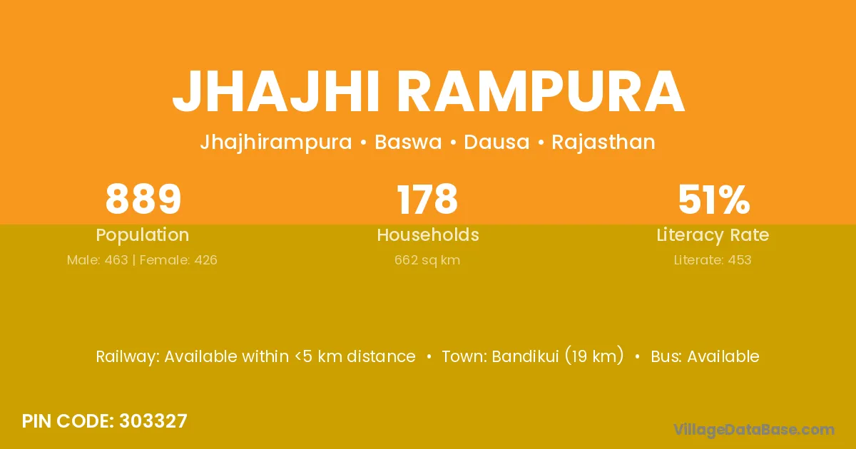 Jhajhi Rampura village has a total population of 889 people, of which 463 are males and 426 are females.