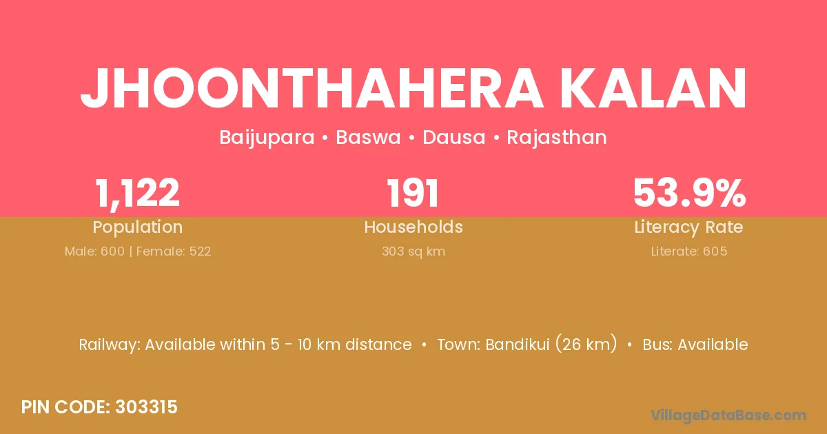 Bandikui (26 km) is the nearest town to Jhoonthahera Kalan village for major economic activities and is located approximately 26 km away.