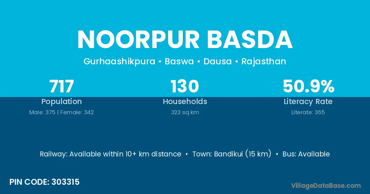 Bandikui (15 km) is the nearest town to Noorpur Basda village for major economic activities and is located approximately 15 km away.