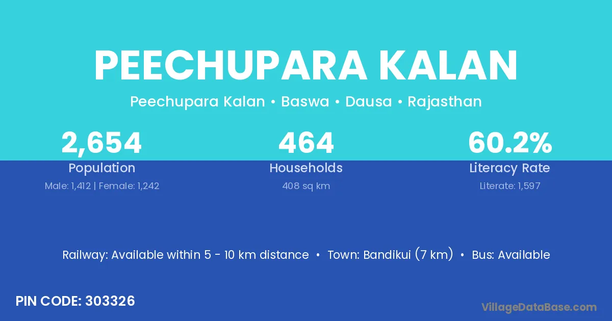 Bandikui (7 km) is the nearest town to Peechupara Kalan village for major economic activities and is located approximately 7 km away.
