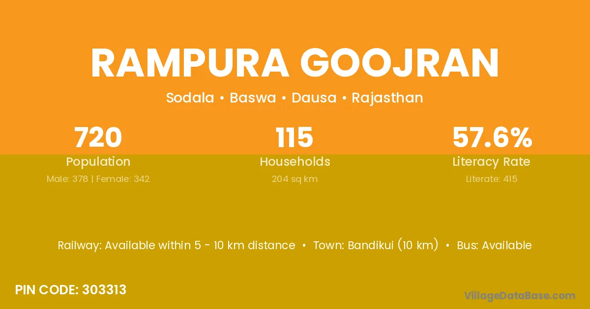 Rampura Goojran village has a total population of 720 people, of which 378 are males and 342 are females.