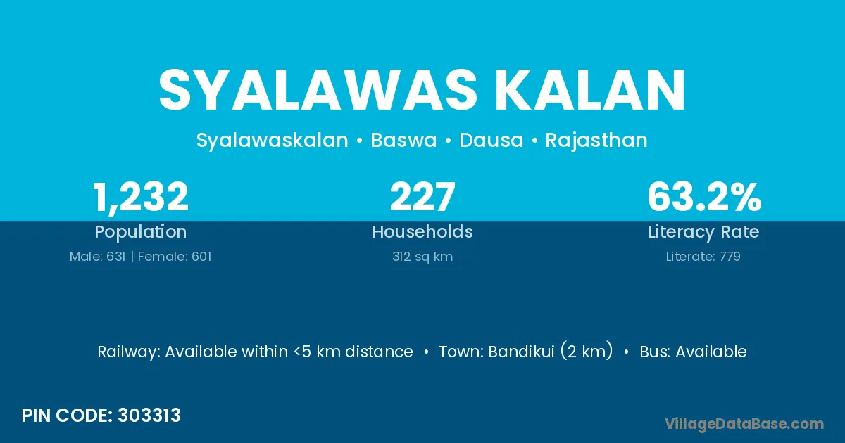 Bandikui (2 km) is the nearest town to Syalawas Kalan village for major economic activities and is located approximately 2 km away.
