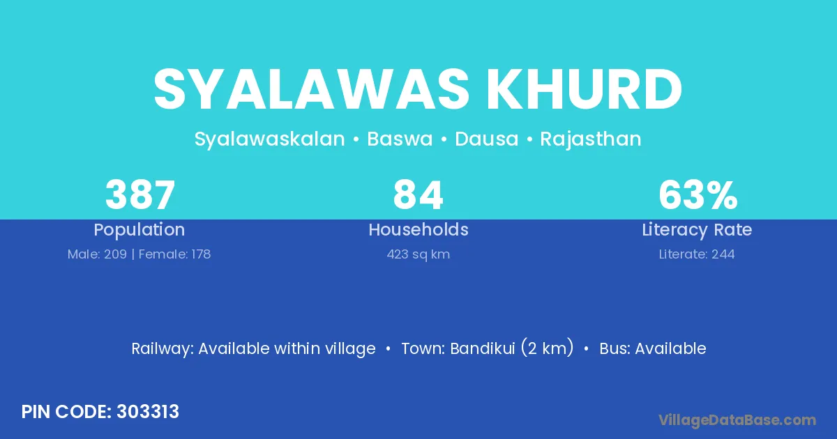 Syalawas Khurd village has a total population of 387 people, of which 209 are males and 178 are females.
