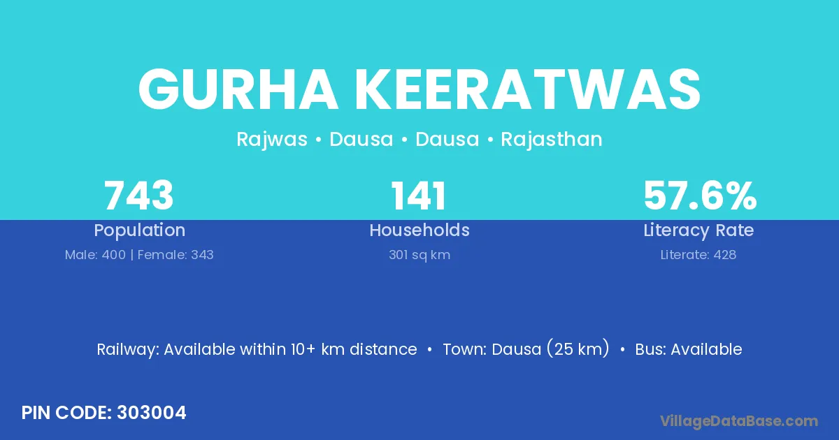 Dausa (25 km) is the nearest town to Gurha Keeratwas village for major economic activities and is located approximately 25 km away.