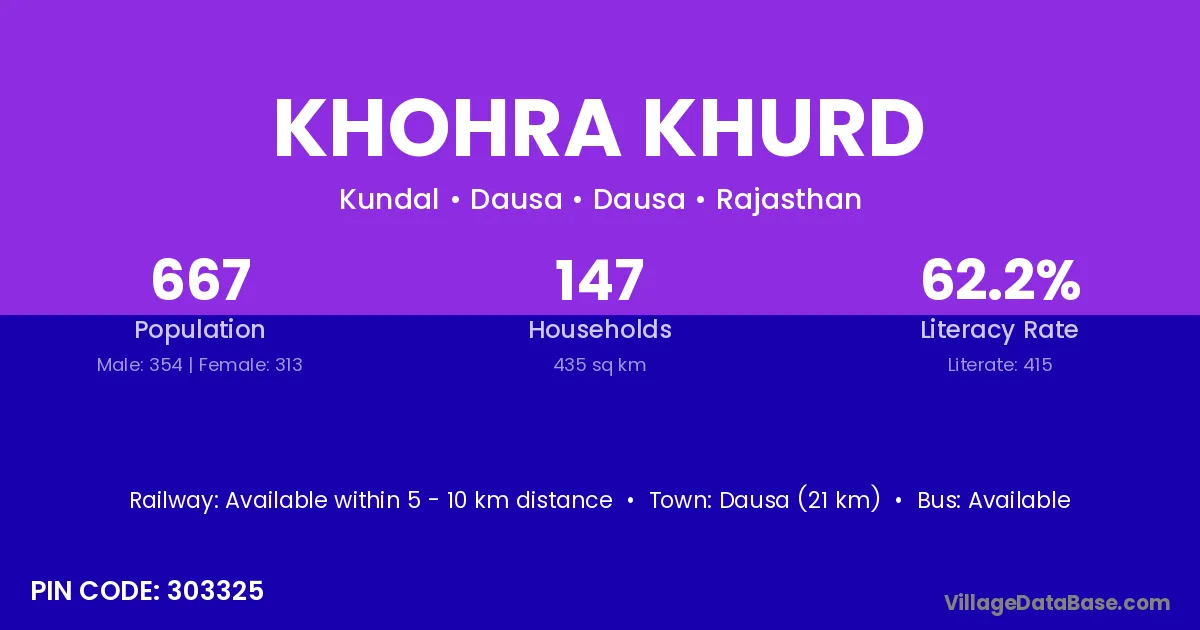 Dausa (21 km) is the nearest town to Khohra Khurd village for major economic activities and is located approximately 21 km away.