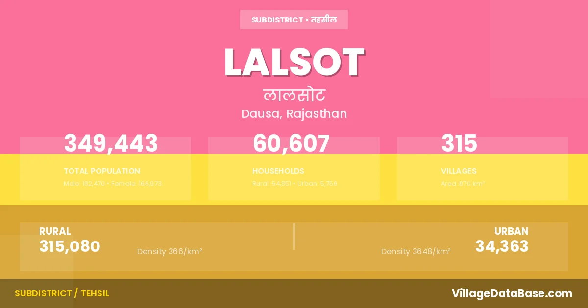 According to the 2011 census The total area of Lalsot Tehsil is 870 km², with a population of 349443 people. The population density is 402 inhabitants per square kilometre, and there are approximately 60607 houses in the sub district.