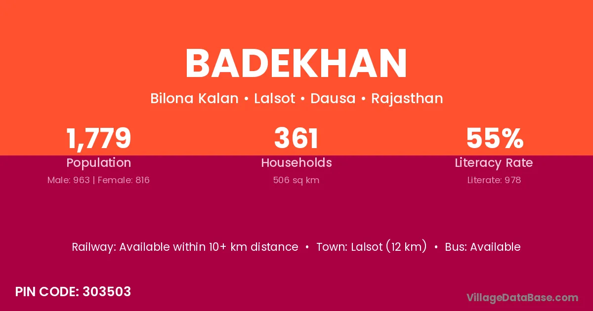 Lalsot (12 km) is the nearest town to Badekhan village for major economic activities and is located approximately 12 km away.