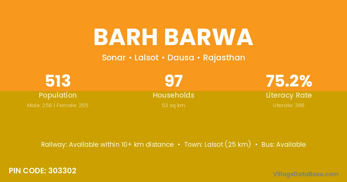 Barh Barwa village has a total population of 513 people, of which 258 are males and 255 are females.