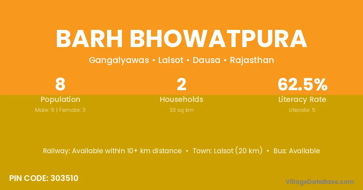 Barh Bhowatpura village has a total population of 8 people, of which 5 are males and 3 are females.