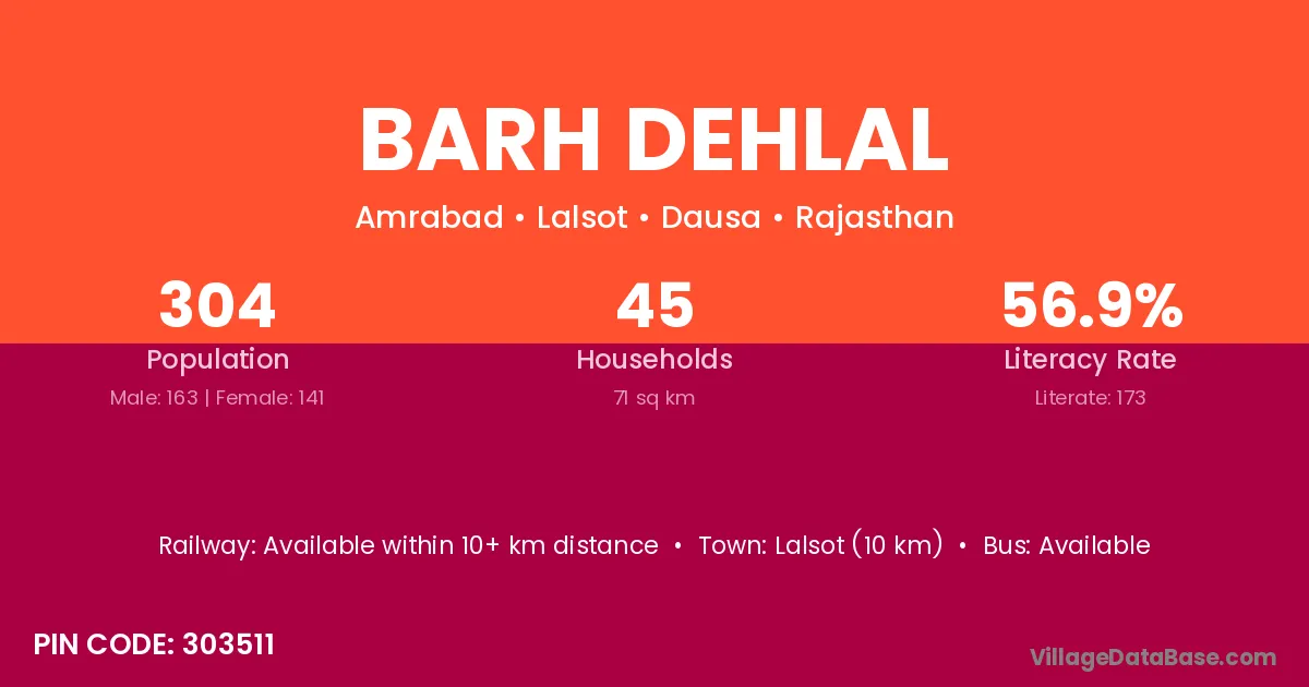Lalsot (10 km) is the nearest town to Barh Dehlal village for major economic activities and is located approximately 10 km away.