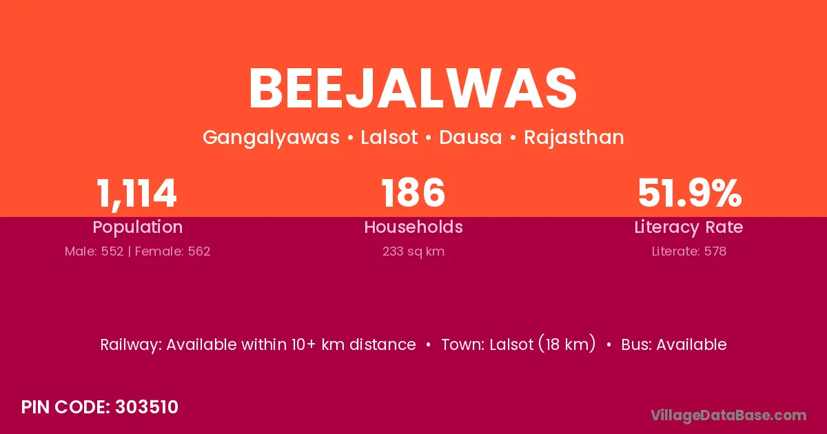 Lalsot (18 km) is the nearest town to Beejalwas village for major economic activities and is located approximately 18 km away.