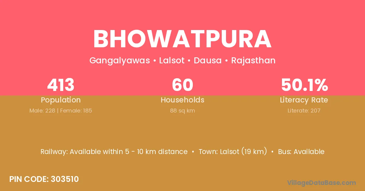 Lalsot (19 km) is the nearest town to Bhowatpura village for major economic activities and is located approximately 19 km away.
