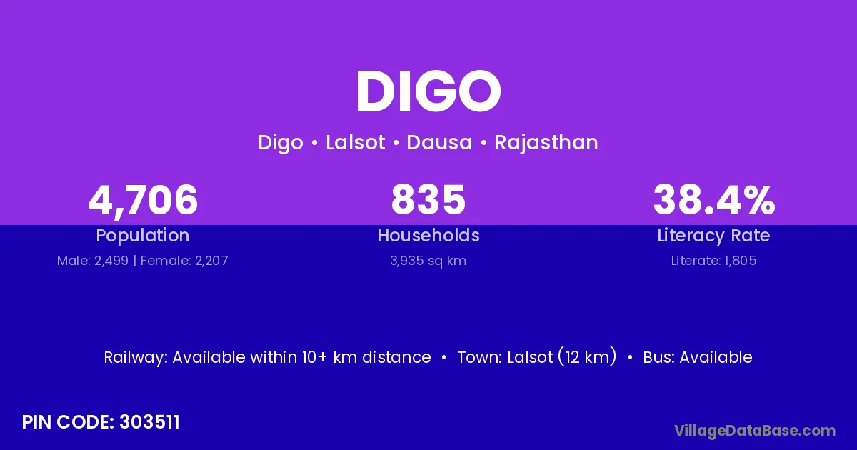 Lalsot (12 km) is the nearest town to Digo village for major economic activities and is located approximately 12 km away.