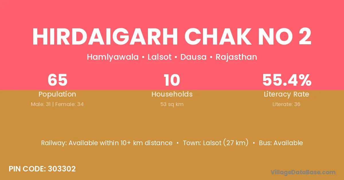Lalsot (27 km) is the nearest town to Hirdaigarh Chak No 2 village for major economic activities and is located approximately 27 km away.