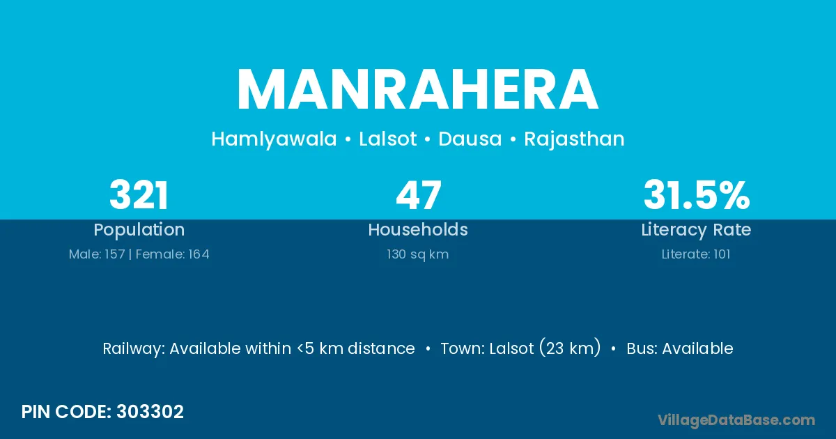 Lalsot (23 km) is the nearest town to Manrahera village for major economic activities and is located approximately 23 km away.