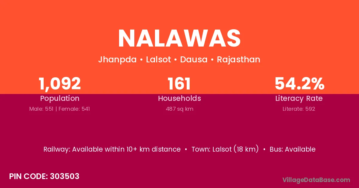 Lalsot (18 km) is the nearest town to Nalawas village for major economic activities and is located approximately 18 km away.