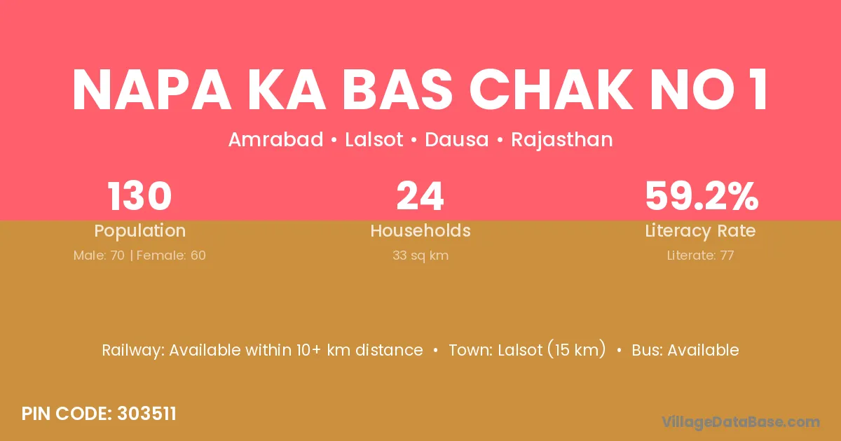 Lalsot (15 km) is the nearest town to Napa Ka Bas Chak No 1 village for major economic activities and is located approximately 15 km away.