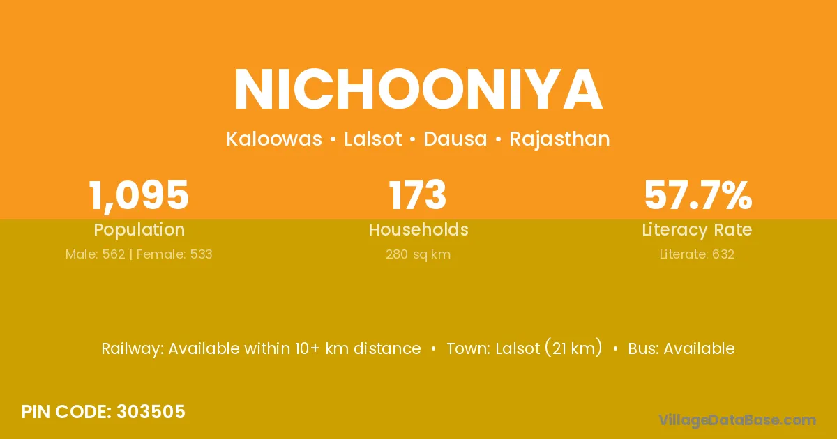 Lalsot (21 km) is the nearest town to Nichooniya village for major economic activities and is located approximately 21 km away.