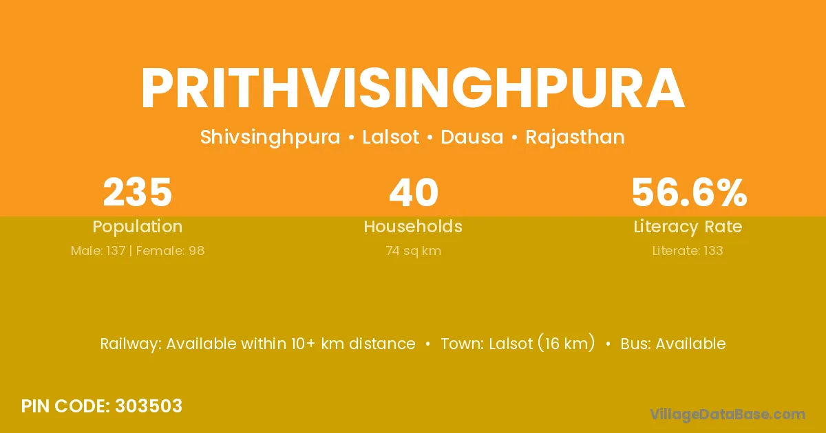 Lalsot (16 km) is the nearest town to Prithvisinghpura village for major economic activities and is located approximately 16 km away.