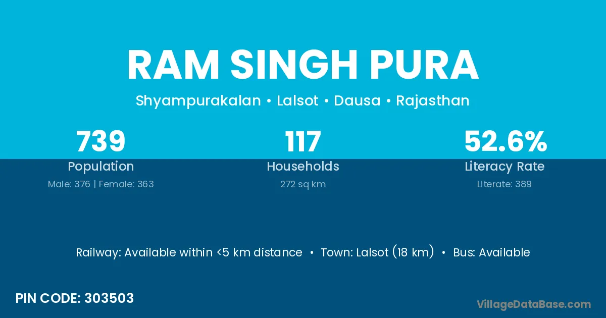 Lalsot (18 km) is the nearest town to Ram Singh Pura village for major economic activities and is located approximately 18 km away.