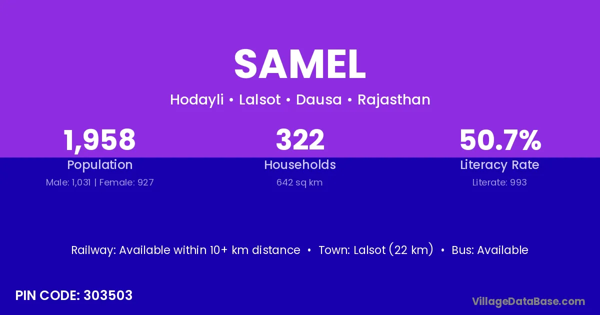 Lalsot (22 km) is the nearest town to Samel village for major economic activities and is located approximately 22 km away.