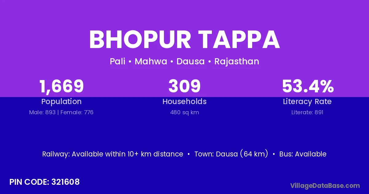 Dausa (64 km) is the nearest town to Bhopur Tappa village for major economic activities and is located approximately 64 km away.