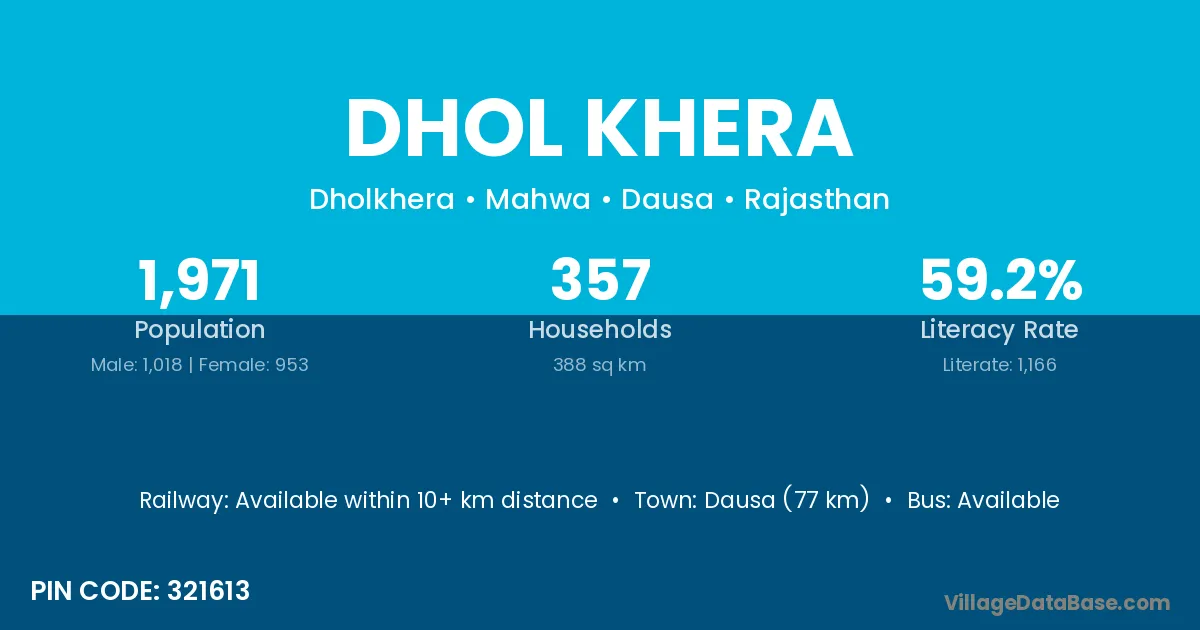 Dausa (77 km) is the nearest town to Dhol Khera village for major economic activities and is located approximately 77 km away.