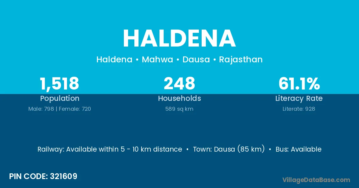 Dausa (85 km) is the nearest town to Haldena village for major economic activities and is located approximately 85 km away.