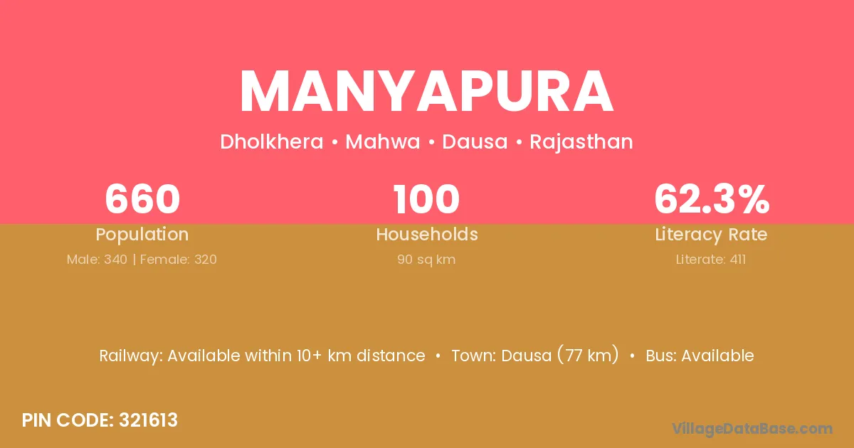 Dausa (77 km) is the nearest town to Manyapura village for major economic activities and is located approximately 77 km away.