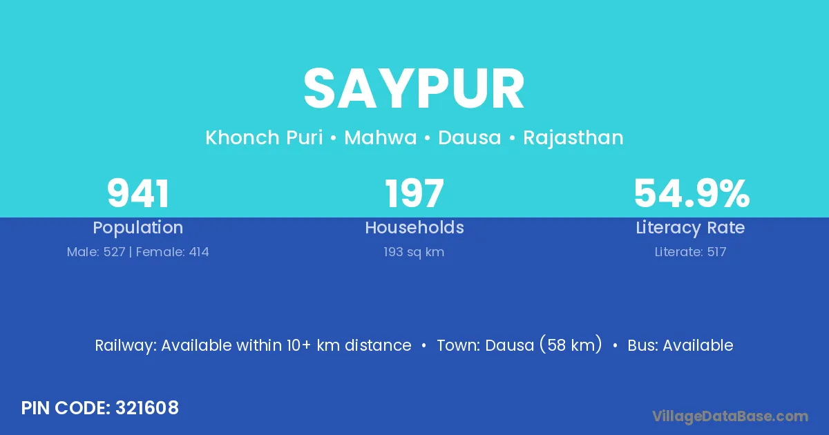 Dausa (58 km) is the nearest town to Saypur village for major economic activities and is located approximately 58 km away.