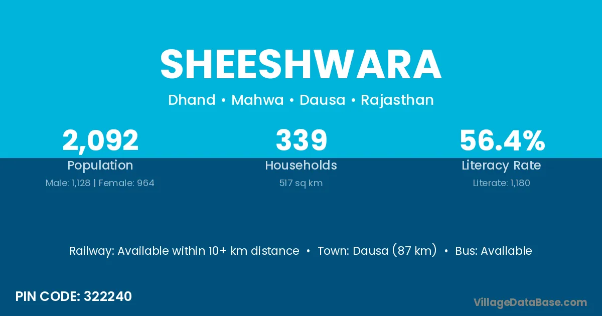 Dausa (87 km) is the nearest town to Sheeshwara village for major economic activities and is located approximately 87 km away.