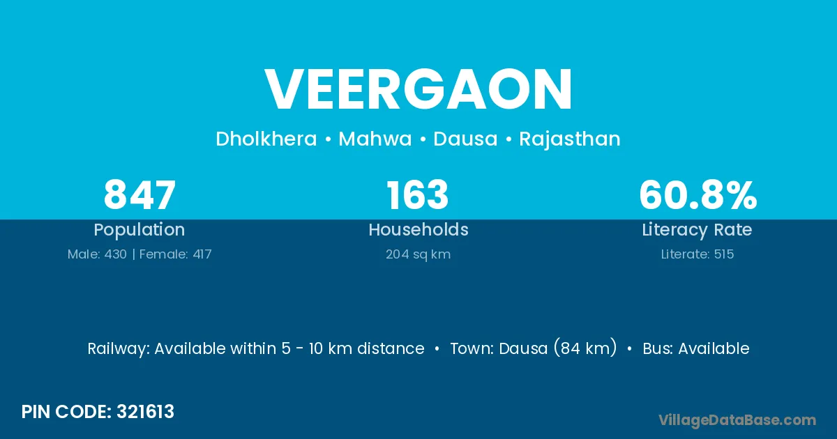 Dausa (84 km) is the nearest town to Veergaon village for major economic activities and is located approximately 84 km away.