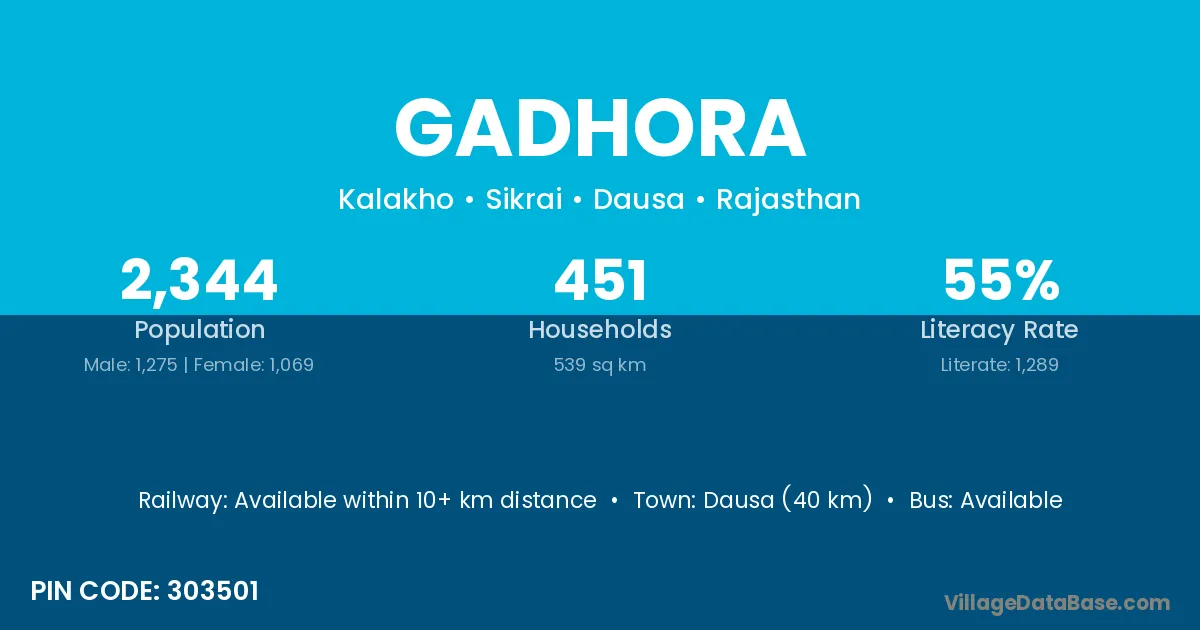 Dausa (40 km) is the nearest town to Gadhora village for major economic activities and is located approximately 40 km away.