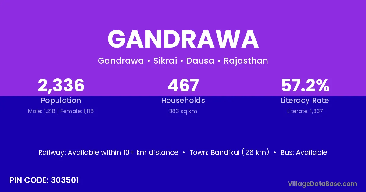 Bandikui (26 km) is the nearest town to Gandrawa village for major economic activities and is located approximately 26 km away.