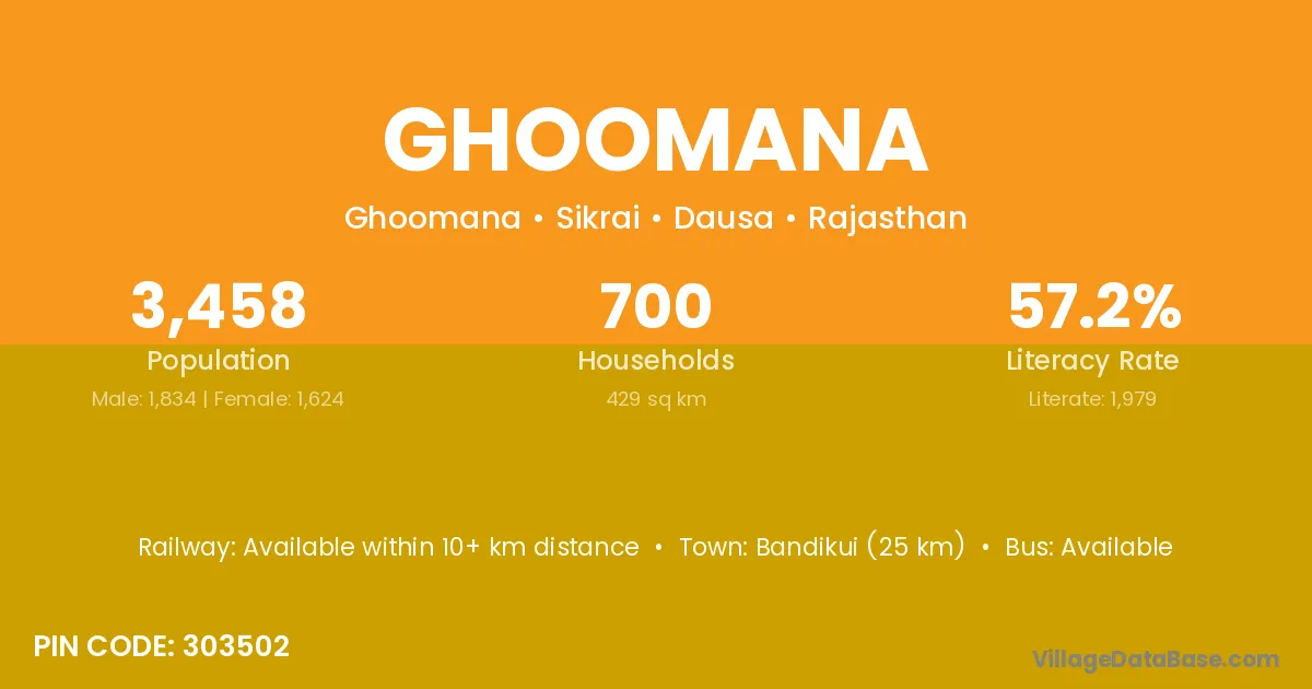 Bandikui (25 km) is the nearest town to Ghoomana village for major economic activities and is located approximately 25 km away.