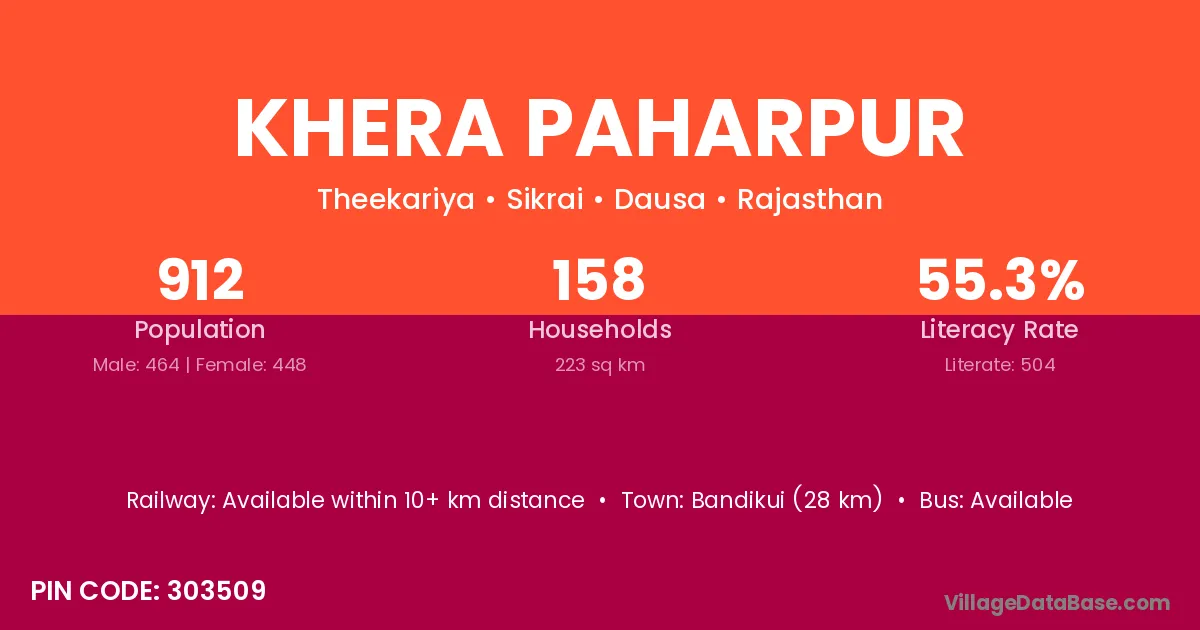 Bandikui (28 km) is the nearest town to Khera Paharpur village for major economic activities and is located approximately 28 km away.