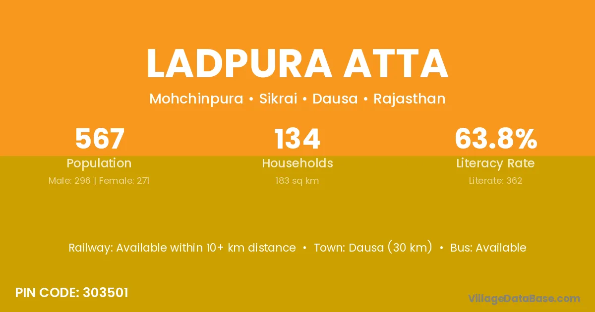 Dausa (30 km) is the nearest town to Ladpura Atta village for major economic activities and is located approximately 30 km away.
