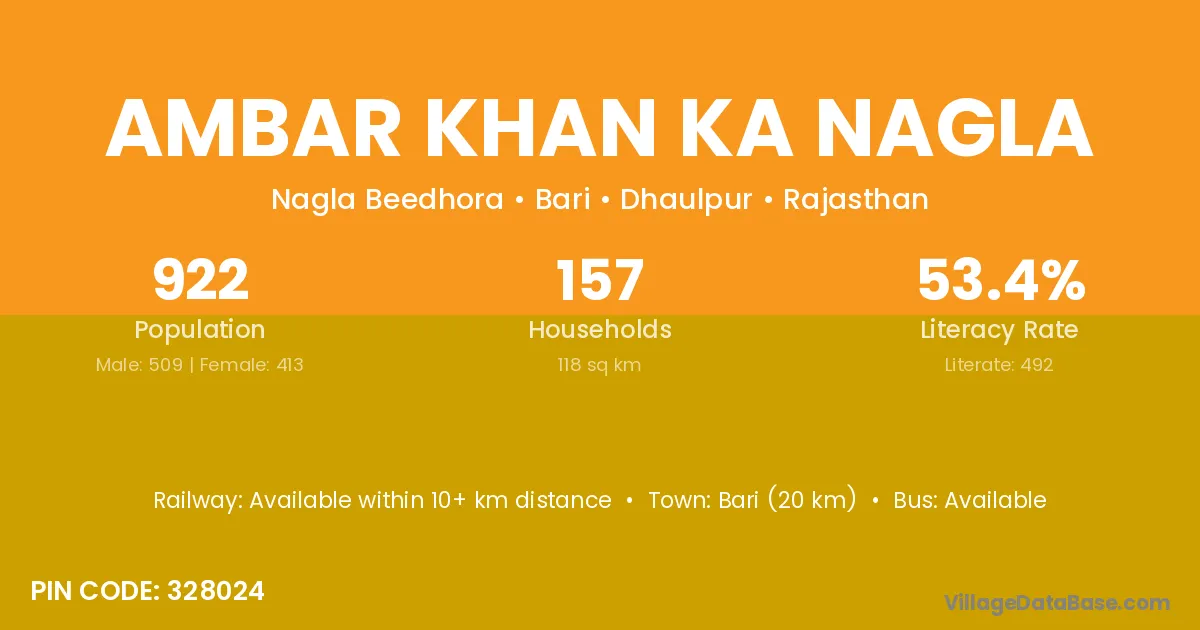 Ambar Khan Ka Nagla village has a total population of 922 people, of which 509 are males and 413 are females.